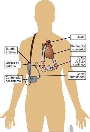 Consta, como todos, de tres partes básicas: un motor-bomba, cánulas de entrada y salida, y una unidad de control. El sistema emplea un rotor axial accionado electromagnéticamente y un estátor que permite asegurar un flujo laminar a la salida de la bomba. El rotor, fabricado en titanio, es la única parte móvil de la bomba y se apoya en cojinetes lubricados por el fluido sanguíneo. Implantación La bomba se implanta por debajo del reborde costal izquierdo, por detrás del músculo recto anterior. Su cánula de entrada de titanio, en ángulo recto, cuenta con un manguito de fieltro para ser insertada y suturada a través del diafragma en el ápex del ventrículo izquierdo (VI). La cánula de salida está conectada a un tubo de politetrafluoroetileno expandido (PTFE®) de 14 mm que se anastomosa a la aorta ascendente. Una única línea de conducción eléctrica sale a través de la piel hacia la unidad de control que ajusta la velocidad de la bomba. La rotación de la turbina del HeartMate® II varía entre 6.000-15.000 rpm y proporciona hasta 10 l/min de flujo continuo. Existen dos modos de control: uno de velocidad fija y otro que se establece a partir de la interpretación del nivel y de la dinámica de la corriente consumida por el motor con adaptación a las demandas. En la actualidad se encuentra en desarrollo un sistema transcutáneo de transmisión de energía con el objetivo de eliminar la necesidad de líneas de alimentación percutáneas. Este sistema emplea dos anillas de inducción, una implantada y otra externa, que actuarían como transmisores de la energía a través de la piel.